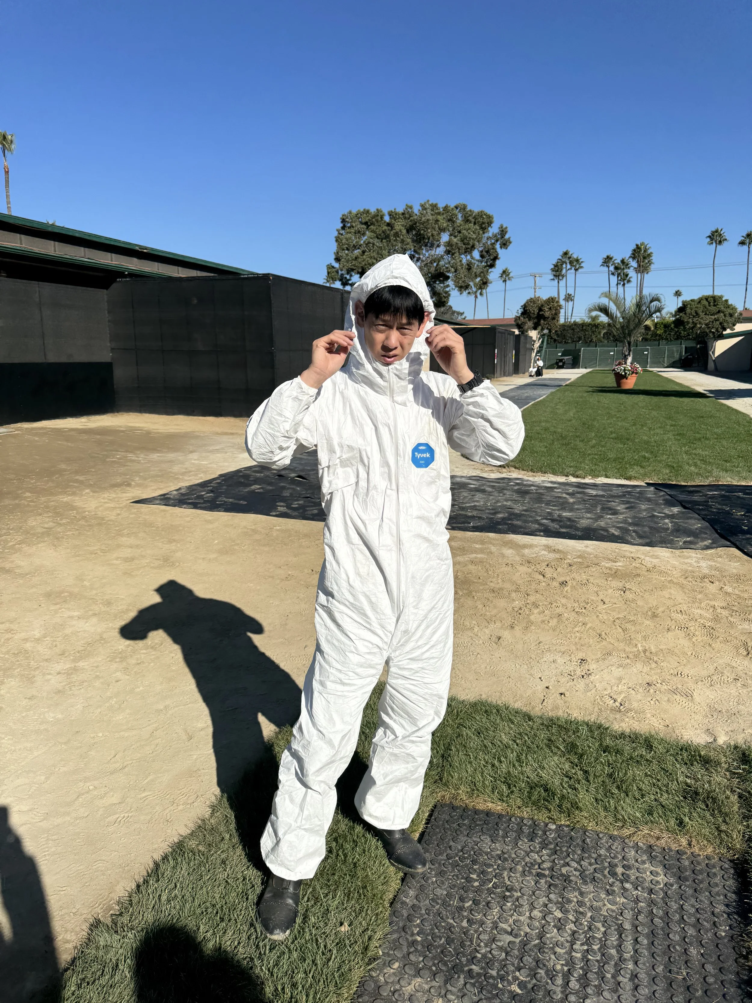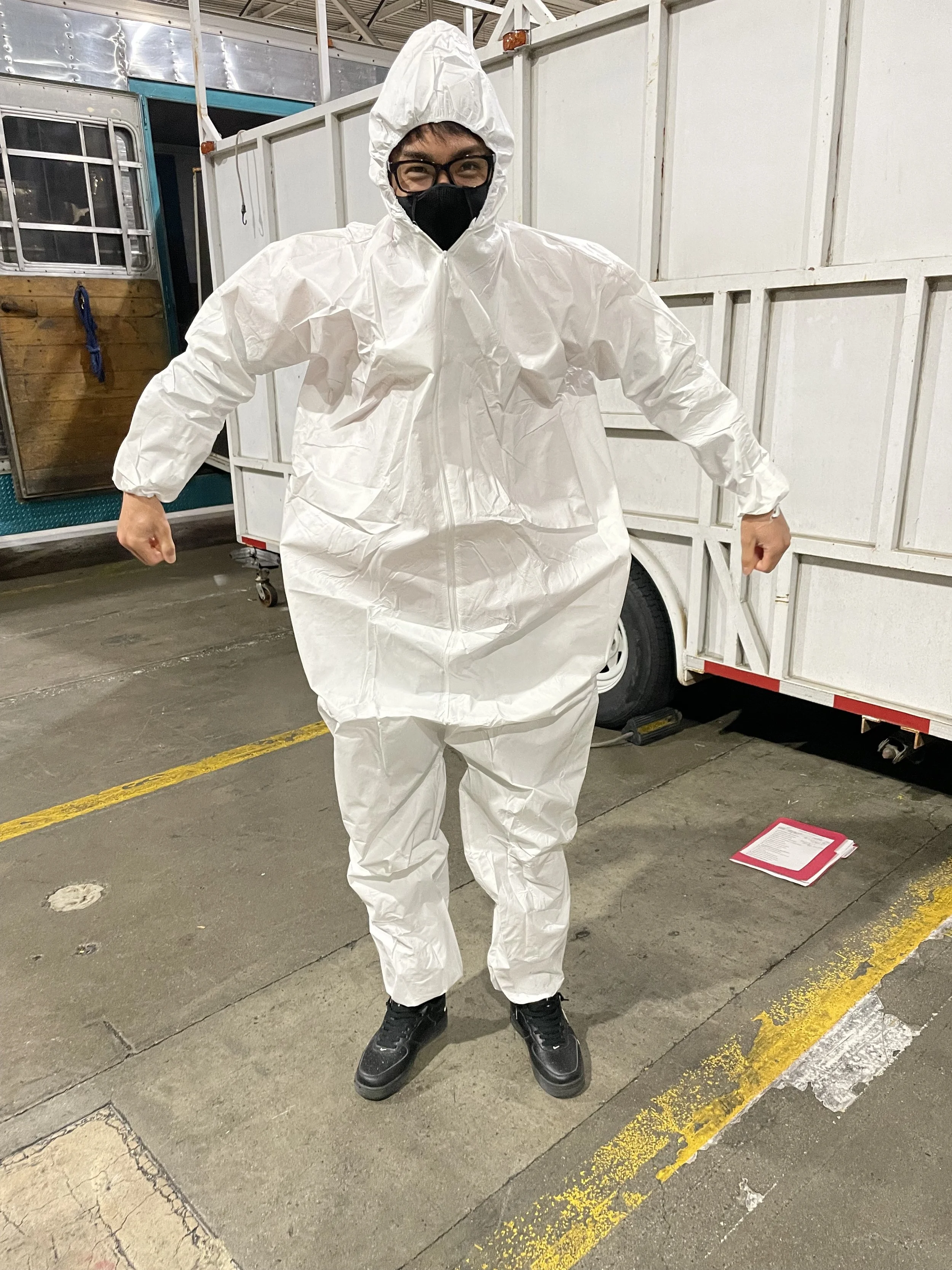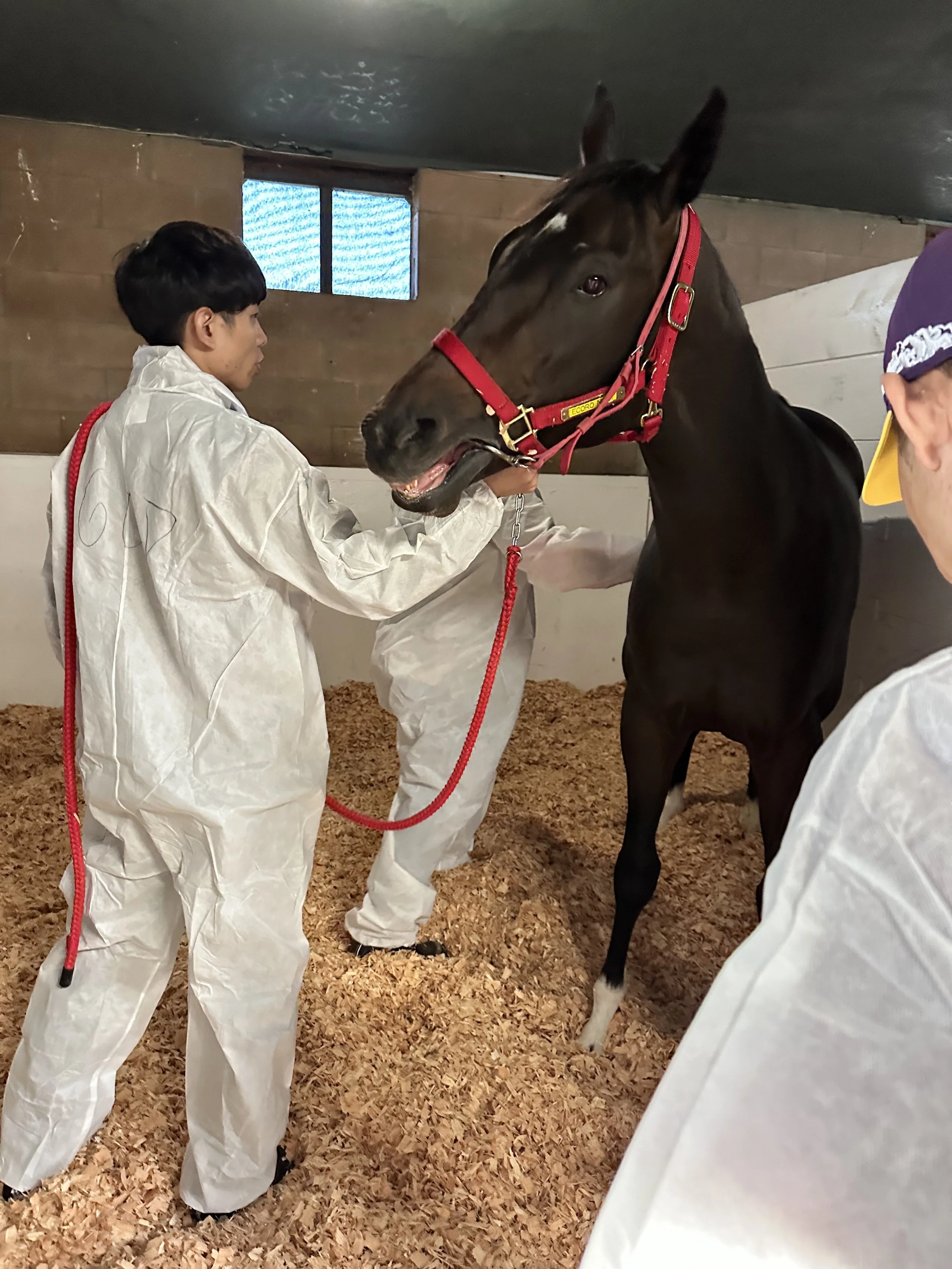 隔離検疫期間中は常時、競馬場以外のUSDAが認定する隔離厩舎に入厩する場合は、馬を見る前に、特別な検疫服(白ボディースーツ)に着替える必要があります。
